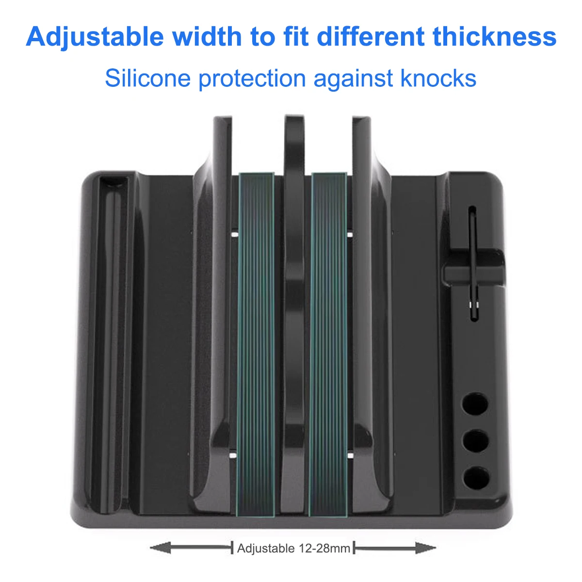 Adjustable Dock — Fits a wide range of laptop thicknesses for a secure vertical hold.