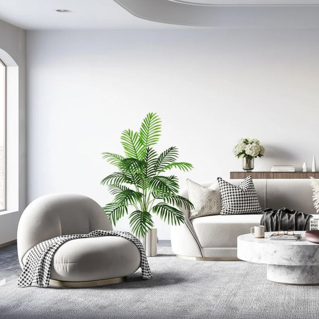 - Artificial palm tree as a decoration in contemporary interiors.