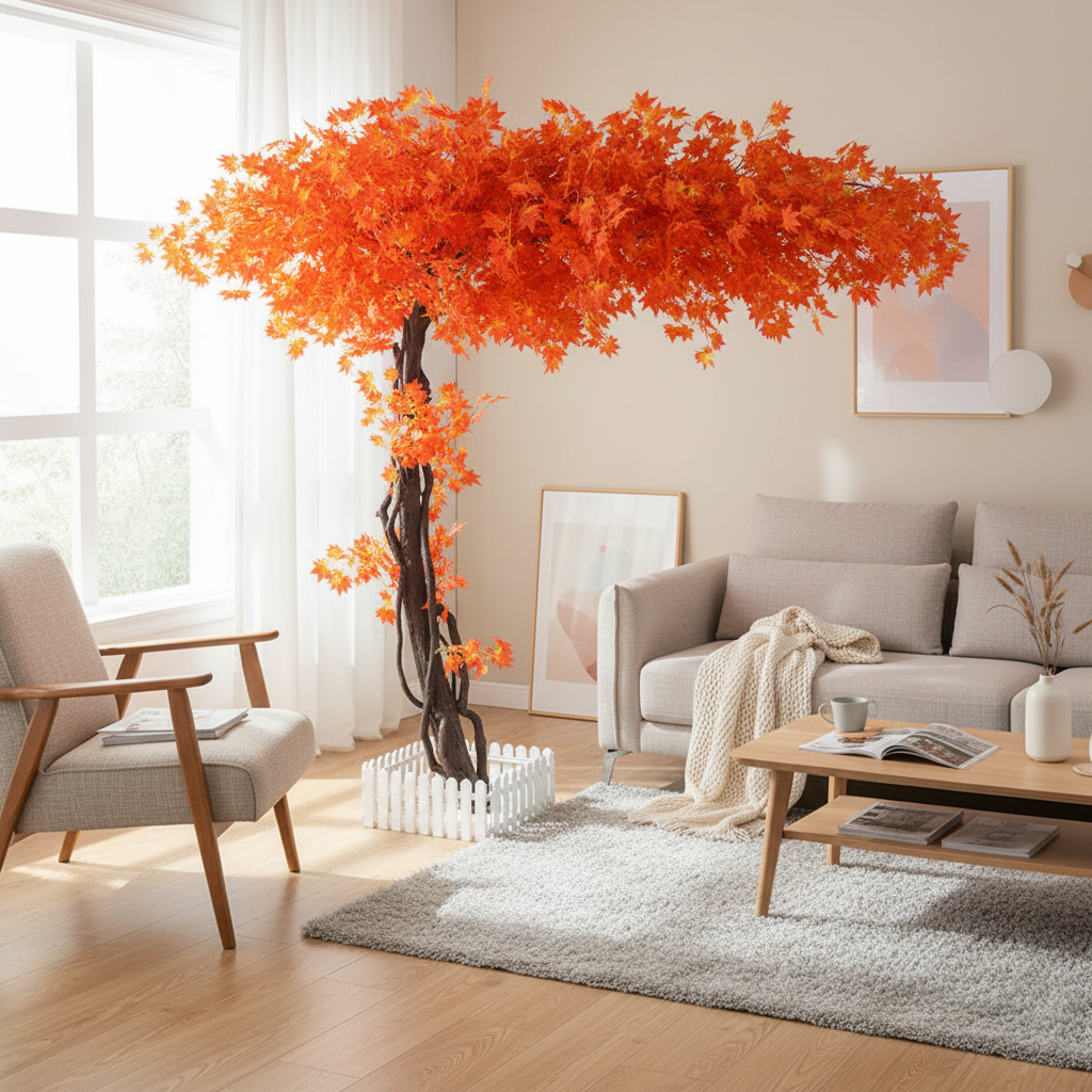• Vivid autumn colours of artificial red maple tree inside UK.