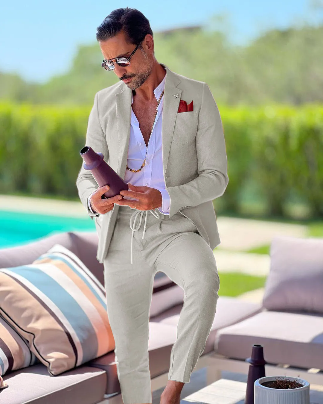 CN Jiangsu Linen Slim Fit Mens Suit Two Piece Wedding Groom by CN: Jiangsu — a breathable, tailored linen-cotton suit designed to keep grooms looking sharp and feeling comfortable during spring and summer wedding celebrations.