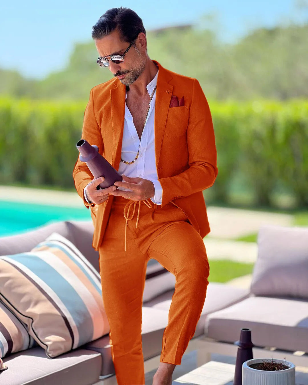 Crafted from a linen and cotton blend, this two-piece suit offers the textured, breathable feel of linen with the softness and durability of cotton. The skinny fit and flat-front trousers deliver a modern, streamlined profile that complements a variety of body types, while the single-breasted jacket provides classic versatility. You’ll notice the lightweight drape and comfortable movement — ideal for long ceremonies, receptions, and photo sessions.