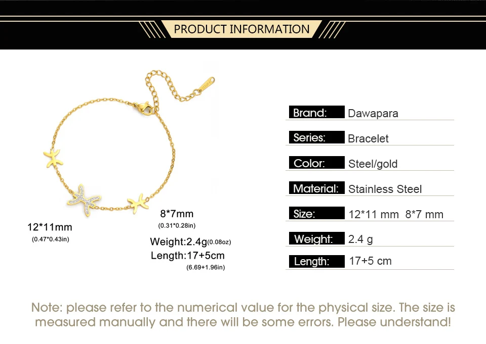 SPECIFICATIONSBracelets Type: Charm BraceletsBrand Name: DawaparaCN: ZhejiangChain Type: Link ChainClasp Type: Box-with-tongueCompatibility: All CompatibleFine or Fashion: FashionGender: WomenHigh-concerned...More