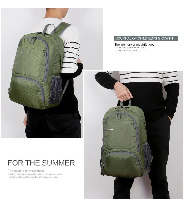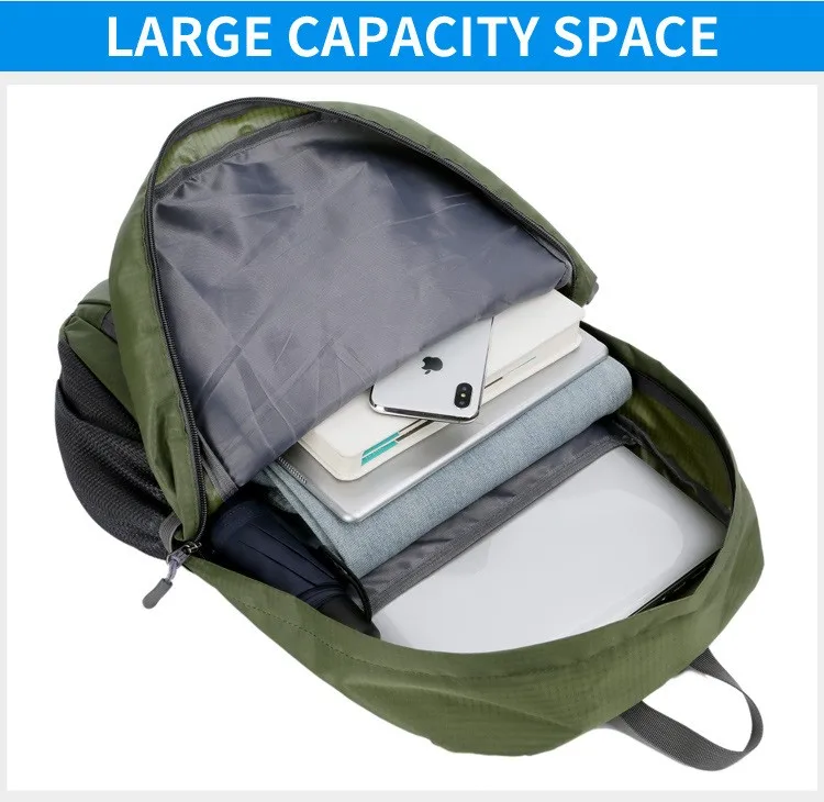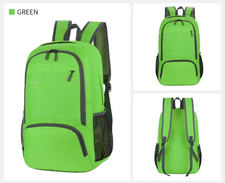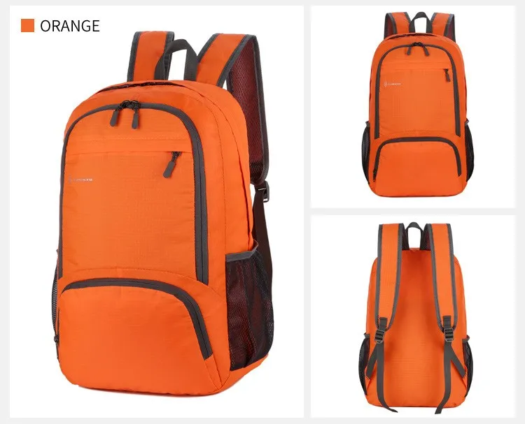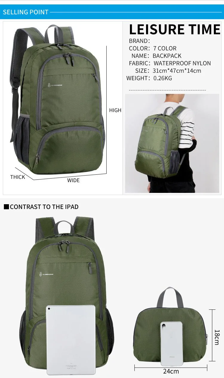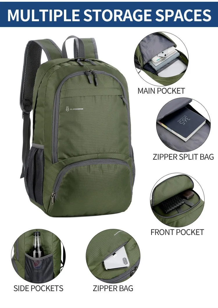 Made with premium nylon fabric, the backpack is lightweight and water-resistant. It features a main compartment, 3 zippered front pockets and 2 mesh side pockets to keep your items organized. It is foldable into a compact size for convenient storage, great for camping, hiking, cycling, traveling, and other outdoor activities.