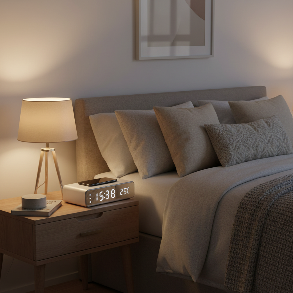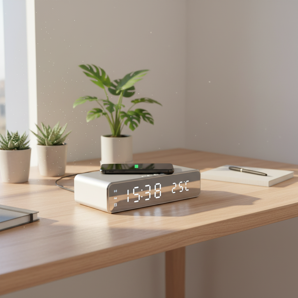 - Bedside clock with charging pad functionality.