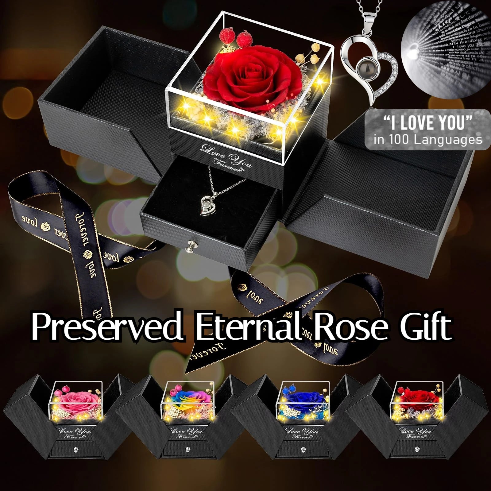 Eternal Rose is uniquely made of all-natural flowers and preserved for 3-5 years. No pollen. No watering is required. No maintenance is required. The rose is surrounded by a lighting atmosphere, making the gifts look more romantic and ceremonial