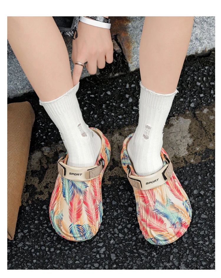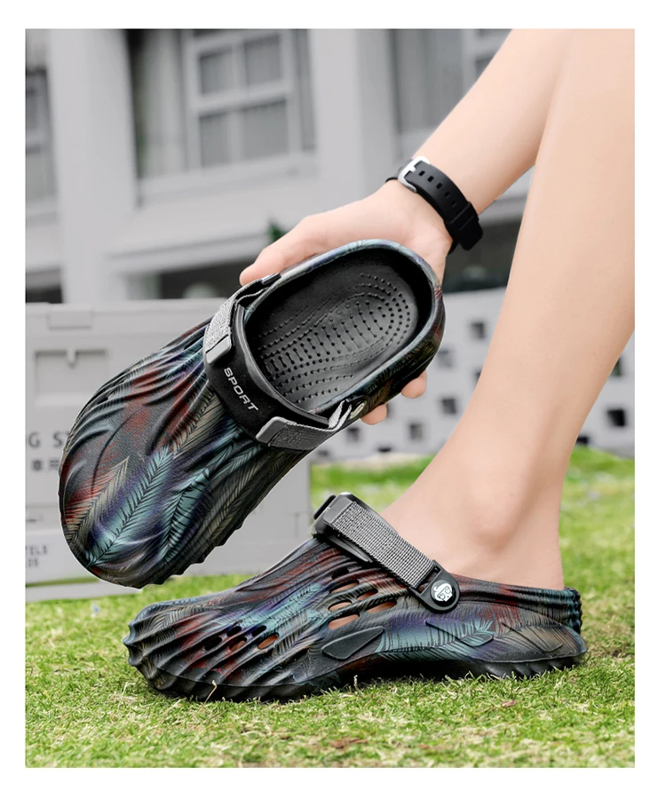 Many outdoor slippers feel flimsy or cause foot soreness after a few hours. These camo clogs use a medium-height (3–5cm) heel and molded EVA outsole to balance cushioning with stable support, so you feel less fatigue and more control on uneven ground. The slip-on design and water-resistant surface make them practical for chores, camping, or a quick trip to the store.