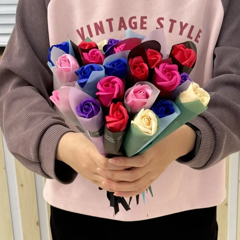 Crafted from soft foam that captures the delicate look and gentle scent of fresh roses, this soap-rose bouquet offers a sensory experience that feels both elegant and comforting. The petals are velvety to the touch, while the arrangement provides a subtle fragrance that lingers without overwhelming the room.