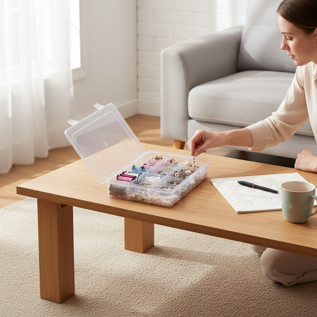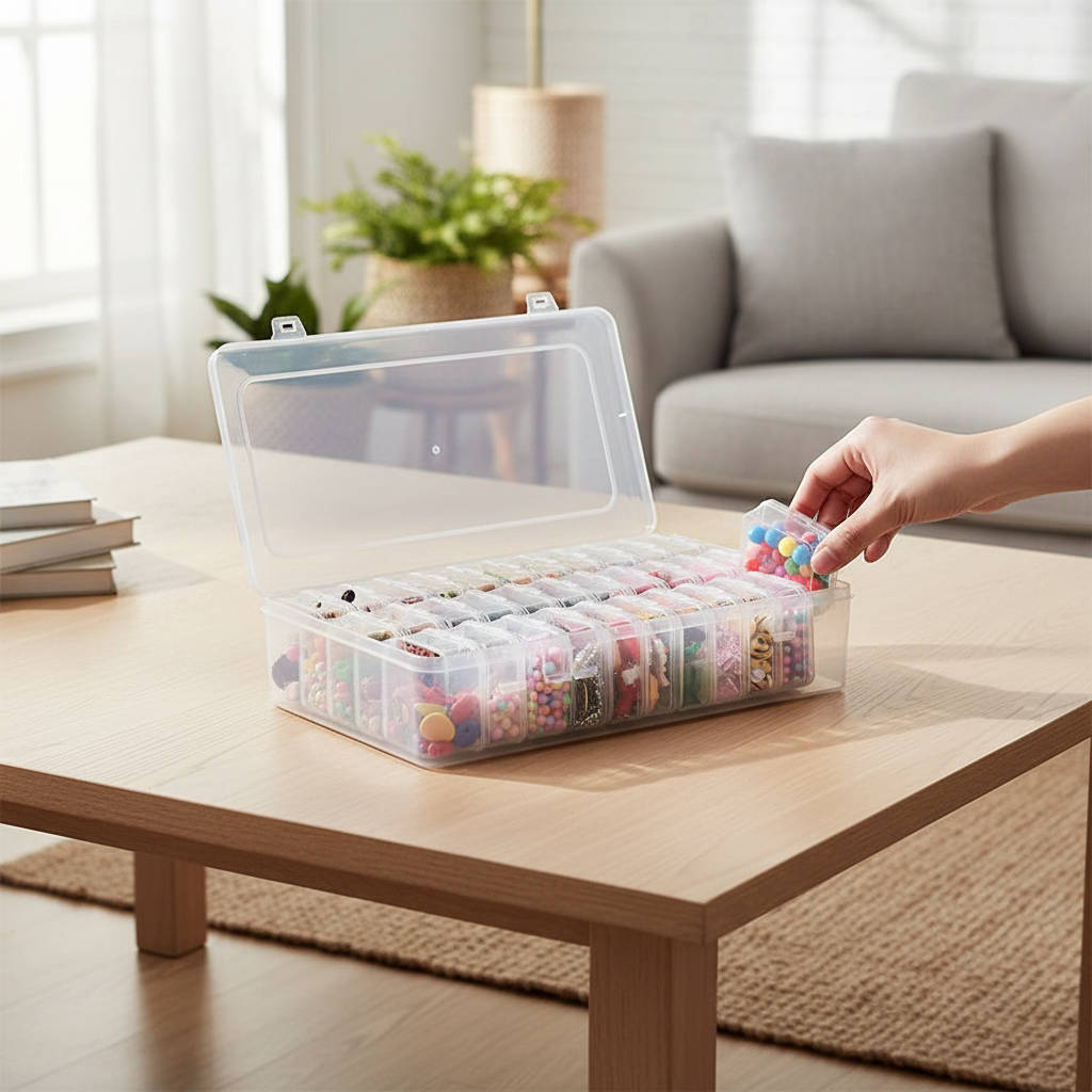 Make your jewellery and small accessories well organised using this transparent storage box. It fits perfectly in the hands of crafters and hobbyists, or busy households in the UK and finds its spot in any of the beads, charms, or tiny parts.