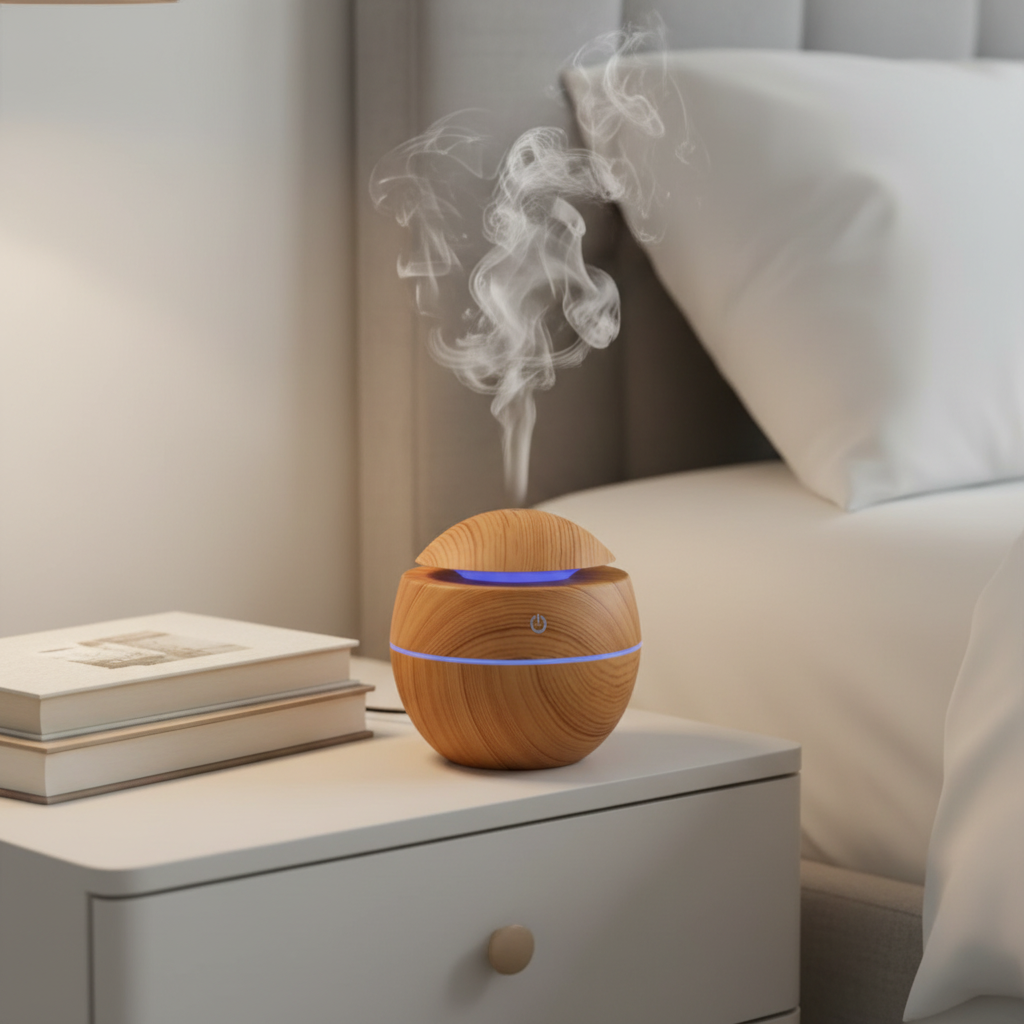 It is an LED light ultrasonic vibration humidifier used at home to produce a fine cool mist. Being a home essential oil diffuser UK, it spreads moisture evenly and does not wet surfaces, contributing to reducing dryness and making the atmosphere in the interior more comfortable in a natural way.