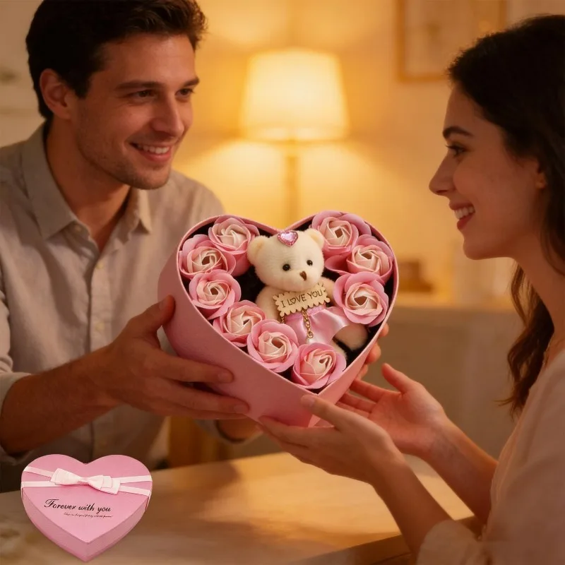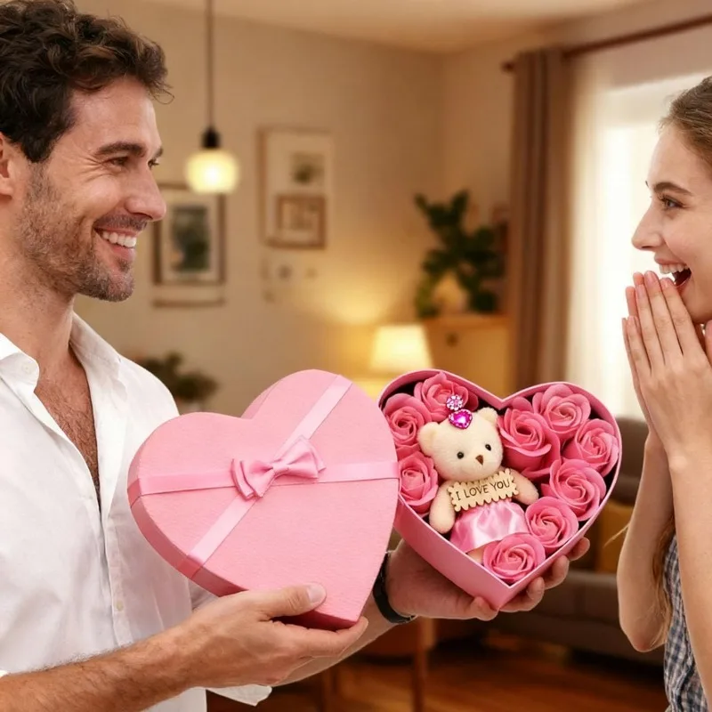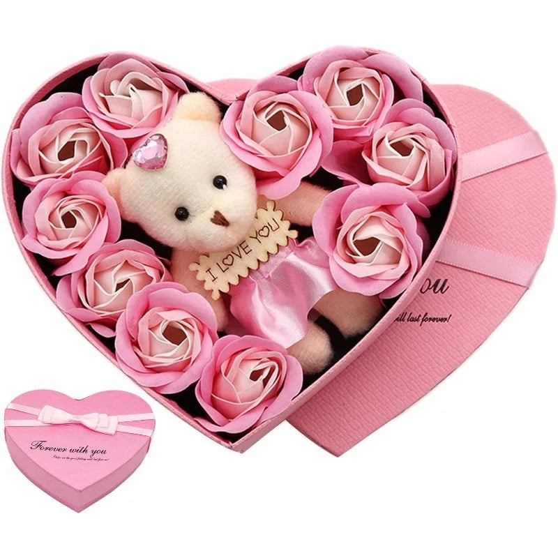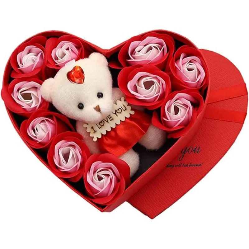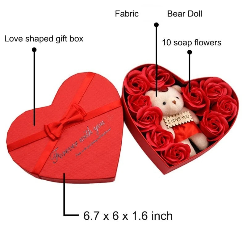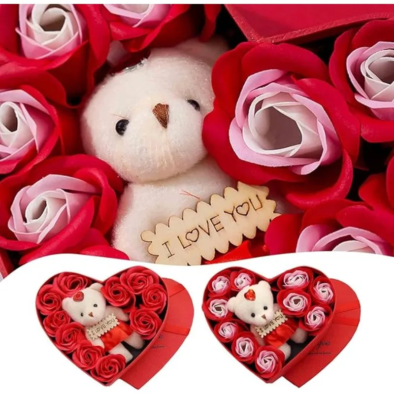 Valentines Day Artificial Rose Flowers Gift Box With Bear For Girlfriend